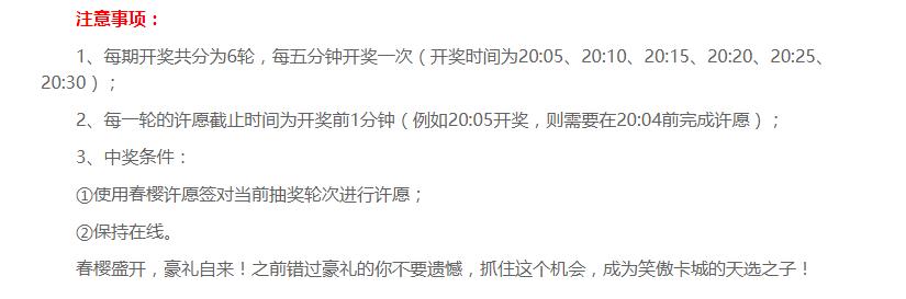 听说你喜欢锦毛鼠可是因为绝版已下架,无法圆梦; 听说你买了锦毛鼠可是忘记了传承石,锦毛鼠现在还在幻兽背包嗷嗷待哺; 听说你的锦毛鼠嘟囔着要变强,可是你囊中羞涩,唯有望“鼠”兴叹; 听说你…… 关于你的所有“听说”,策划大大都安排上啦!他来了,他来了,周末许愿他带着豪华大礼又来了! 上一次的周末许愿是不是还有好多心愿没有实现呢?没关系,这一次,你还有希望!2期许愿,每期6位幸运玩家,正式服的神秘大奖也揭开神秘面纱,3星开天幸运盒、开天之曜自选匣!从幻兽幻化材料到年兽礼包,从3星开天幸运盒到开天之曜自选匣!所有变强的方式,都在许愿第二期统统满足你!  开奖时间为3月1日(星期天)和3月8日(星期天)的20:05、20:10、20:15、20:20、20:25、20:30,原本中奖条件是需要玩家“保持在线且在春樱福地地图的五个许愿范围内”,这样的设定就有点苛刻拉~毕竟星期天的晚上20:00-20:30有宿命对决啊!一不小心打上前十,一不小心拍卖7-8号箱子,那600+魔石是是妥妥的收入囊中啊!可是许愿大奖也好想参加啊,这些奖品都想要,万一幸运女神降临我头上呢?就在这鱼与熊掌二选一的时刻,策划小哥站出来了——既然是这样,我就改规则,鱼与熊掌都给你们,谁让你们是我最宠爱的小宝贝呢!  对当前轮次进行许愿的玩家,只需要在线,只需要在线,只需要在线!就有获奖机会! 你还不心动吗?让我们一同共赴这场春樱盛宴,一同享受收获大奖的喜悦吧!