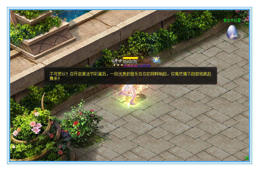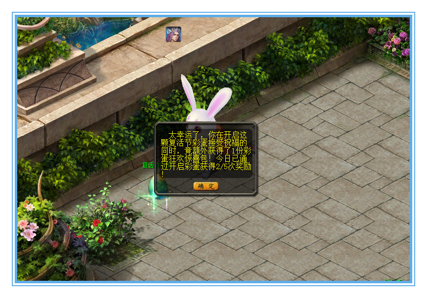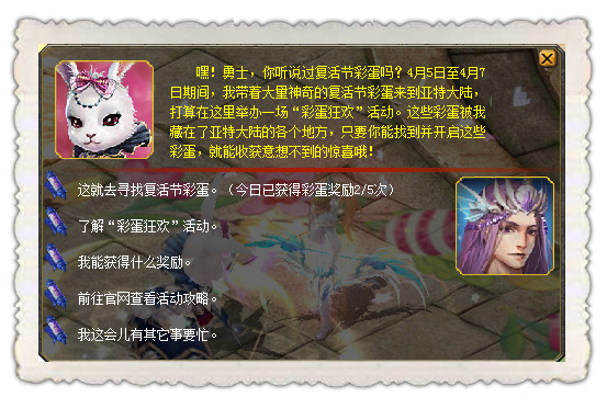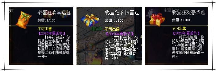 每年春分月圆之后的第一个星期日,就是象征着重生和希望的西方传统节日:复活节 了,传说当年耶稣被钉死在十字架上,但是第三天,他的身体复活了,复活节因此得名。 作为一款西方魔幻类网游,我们的魔域自然也会在复活节举办活动,来回馈广大玩家。 今年的复活节是4月12日,在这一天,我们的复活节精灵·罗娜将会举办一场“彩蛋狂欢”活动,届时,罗娜将会把复活节彩蛋藏在亚特大陆的各个角落,只要找到这些彩蛋,就会获得各种奖励。  复活节除了是纪念耶稣复活以外,还是西亚异教神明巴力和亚斯塔路降生的日子,相传亚斯塔路生于一枚天鹅蛋之中,被巴力寻找获得,抱在怀中孵化出一只兔子,兔子长大后成为一个美女,那就是亚斯塔路,所以魔域很用心的把复活节精灵的形象做成了一只兔子。 好了,下面进入正题,这些复活节彩蛋藏在哪里呢,让我们一起来找找看。 看来罗娜藏蛋的技术并不高超,小记一来就找到了一个复活节彩蛋,可惜没有获得奖励,不过优美的音乐让小记忍不住翩翩起舞。 在经过几次尝试之后,小记终于是开到了奖励,一份彩蛋狂欢惊喜包。 这种彩蛋狂欢包一共分为三个等级,分别是彩蛋狂欢幸运包、彩蛋狂欢惊喜包、彩蛋狂欢豪华包,其中豪华包中可以开到4级兽灵圣水,30星神XO礼包等好礼,每个参与的玩家每天可以有五次获得狂欢包的机会。  这次复活节的活动是不是很简单呢?在如今全球抗疫的大背景下,这么一个象征着重生和希望的节日,值得广大魔友们一起等待它的到来。