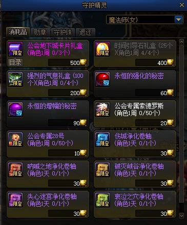 这次公会商店更新了时间引导石礼盒,强烈的气息礼盒,公会人偶和神器守护珠礼盒。