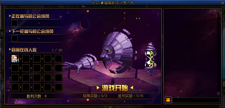 至少需要3名公会人员才能进行游戏,一共进行20轮。每轮开始时玩家有5秒时间从石头剪子布中选择一个与NPC对决。胜利将会得到“胜利之公会庆典礼盒”,输掉则不会获得奖励。游戏结束时会根据玩家的胜利次数进行结算。玩家每天可以获得15次胜利奖励和3次结算奖励。