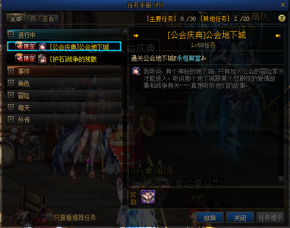 在玩家使用公会地下城使用券后会获得“公会庆典:公会地下城”的任务,完成任务会获得特别的公会庆典礼盒,开启后获得10~90个公会硬币。
