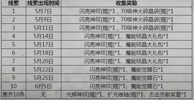 明日第十条线索出现,玩家收集第十条线索可以获得闪亮神纹【赠】*1和魔能觉醒石*1(魔能觉醒石是新幻兽养成的重要道具哦!),第十条线索的出现也就意味着玩家可以凑齐全部线索了,而凑齐全部10条线索的玩家,除了每条线索的分别奖励以外,还可以额外获得光辉神纹【赠】*1、扩充卷轴【赠】*1、杰出贡献奖章*1(杰出贡献奖章据说是在后期用来开启丰厚豪礼的关键道具哦!)。