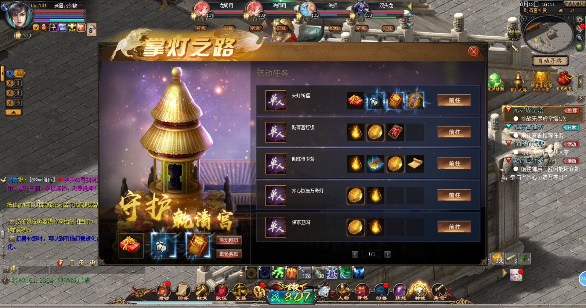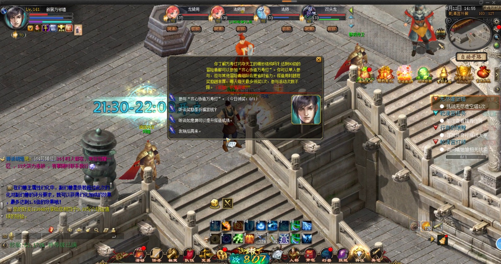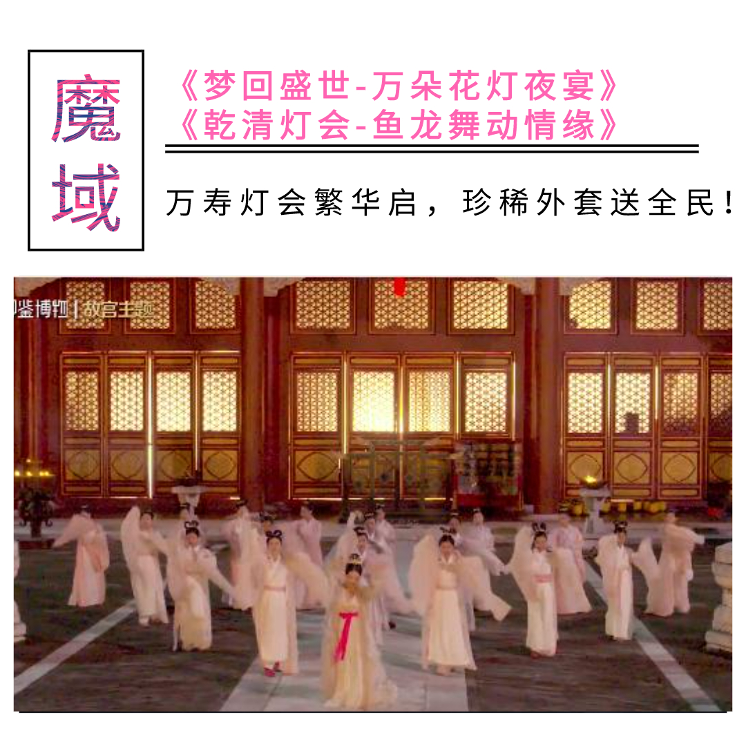 各位亲爱的魔友们,大家好! 你们最爱追求美女,咳咳,最爱追求美学的小记者又上线了! 这个美学呢,有华服秀丽之美,也有美貌动人之美,更有大国风范之美! 华服秀丽,让人向往手痒,自己也要穿上一件,丝滑飘逸。 美貌动人,让人心动难忍,顿生爱慕亲切之意,君子好逑 。 大国风范,让人崇拜敬佩,繁华都会高贵城池,梦回乾清。 这些美都是可遇而不可求,若是有缘得见,定是绝佳享受!  看到这里有魔友要问了,要是碰不到那你说那么多干嘛? 嘿嘿,咱们的魔域,一次把这些全部汇集到了一起! 想看华服秀丽?最飒爽最侠气的珍稀外套,免费赠送! 想看美貌动人?全新剧情联动故宫俏娘子,免费...咳咳,观看! 想看大国风范?乾清宫万寿灯会,人声鼎沸,热闹非凡! 一切尽在咱们魔域跨界合作破壁联合的《乾清宫万寿灯会》!  还记得上次魔域推出的《太和殿》,魔友们纷纷跑去锻造金砖,打扫大殿。 那只萌哒哒的小跟宠最后变身守殿的石狮子,一定让很多人吓了一跳吧! 而这次呢,轮到乾清宫了! 乾清宫,一直是皇家受贺,大宴的指定场所。康熙皇帝曾举办“千叟宴”庆祝自己的生日,而元旦时的皇室家宴,也同样在此举行。据说碗盘放了109盏,菜品多达200余种。嗯,如果小记能穿越过去,一定大吃特吃! 当然,祈福灯会也是在这里举行噢! 想必魔友们在电视里也见过格格太子,娘娘宫女们,祈福放灯,叠荷花船的情景。如今呢,可以在魔域里好好体验一把啦! 【天灯祈福】【乾清宫灯缘】【助阵侍卫营】【齐心协造万寿灯】【保家卫国】。  五大任务,一眼看上去就仿佛让人回到了那个恢弘壮阔却又“古色古香”的时代。 小记漫步在这座古老的皇宫大殿,回味着曾经发生在这里的一切,身临其境般的感受。 不能只是闲逛呀,小记决定去做做任务。首选身份选择侠客,走起! 这么多的漂亮宫女小姐姐?爱了爱了!  这掌灯特使,一定是皇上的“咖妃”吧! 觅宝术找宝贝喽,看看藏哪里了!   还帮人家跑腿姻缘签,小记心里说:我愿意!  任务并不困难,一般都可以过去的,非常之easy。 最重要的,每位得到“祈福天灯”与“天灯集缘”画册的魔友,都有机会将“祈福天灯”升至10级,以获得成功点亮万寿灯的机会。 而将祈福天灯升至10级的勇者,可获得永久时效的祈福天灯•福缘外观玩具和临江仙外套。 又送免费外套啦,小记先来试穿下!   嗯,又帅又飒!看来策划一定收集了魔友们,不想要服装太萌的建议! 这上等的绸缎料子,金饰坠袖,亮片莹莹,璀璨不断,流苏漫漫! 穿在身上,怎么就那么地潇洒呢!越看越喜欢! 这么有趣的任务,这么美美哒的衣服,魔友们速度行动啊!争取一步到位,两步得豪礼,三步人生赢家! 琉璃盏开天灯升,魔友祈福豪礼成! 万寿灯会繁华启,珍稀外套送全民!
