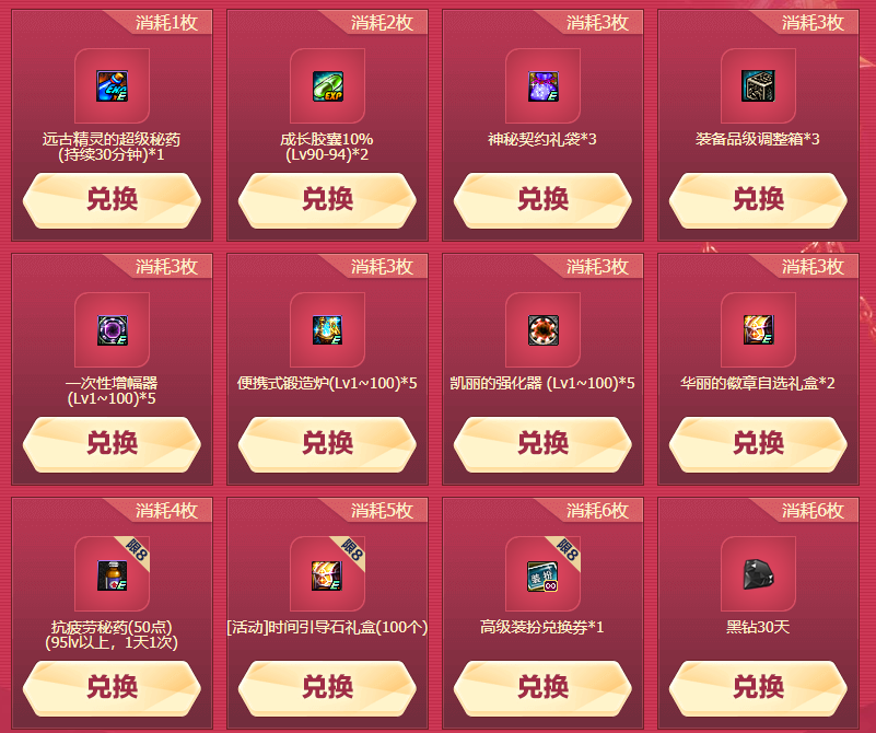 活动期间消耗令牌可兑换相应的道具,每份道具单Q最多兑换20次,特别的奖励有专门的单Q限制。