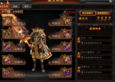 屠龙神装是烈焰BT中核心套装之一 每件屠龙装备都有独特的属性与BUFF 集齐套装还可以极大增强属性与降低被爆装几率