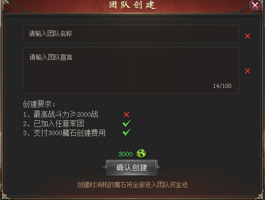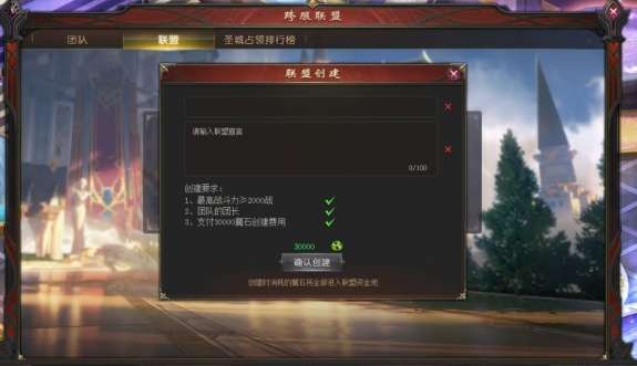 战斗力≥2000,是任意团队的团长,未加入任意联盟的勇士可以创建属于自己的联盟。 创建联盟需要消耗30000点魔石的创建费用,创建时消耗的魔石将全部进入联盟资金池。 已消耗的30000魔石将成为联盟资金,可用于联盟召集等公共功能的消耗等。 是团队团长,未加入任意联盟的勇士可以申请加入联盟。等待联盟管理审批通过后,就可以成功加入联盟了。 联盟的盟主或总指挥可审批或开除下属团队,分发联盟奖金,还可任命精英,发起“联盟召集”。 加入联盟的优势: - 1、加入联盟后同一联盟的所有团队成员互为友盟。在圣城相遇将并肩作战,协同作战时省去了互相加团的烦恼。