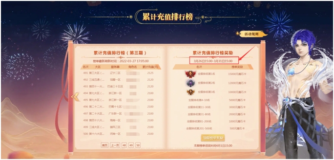 累充排行榜也进入第三期的最后三天冲刺,截止时间为3月31日15:00,前500名皆有丰厚的魔石卡奖励,最高可得15000万魔石卡!