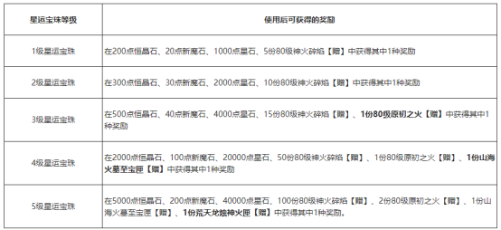 碎星神石福利多 2022年4月20日至2022年4月30日期间,受天星交汇影响,“罪罚之窟”、“赤帝龙脉”(含跨服战场)中的首领魔怪近期获得了更强大的力量——被冒险者击败后,将撤至星能屏障内疗伤。(不影响开启战利品宝箱) 想要破坏屏障、追击挑战首领魔怪,需要至少1名冒险者嵌入碎星神石(可在传奇行商钱大亨处购买)。队伍总共镶嵌的神石数量越多,挑战难度越低,每次挑战每人最多可嵌入1枚碎星神石。 使用碎星神石后,对魔怪进行挑战,嵌入星石者必获得星运灵药剂,海量星石和神火碎焰,还有机会获得对应神火难度可产出的荒天龙烛或原初之火;挑战赤帝龙脉难度神火,除上述奖励,还将额外获得80级神火火灵,是不是超级给力? 未嵌入碎星神石的队友也可以获得大量的80级神火碎焰和星石奖励!挑战赤帝龙脉难度时将获得80级火灵,还有机会获得星运灵剂! 一人嵌入碎星神石,全队受益。小伙伴们可以合作共赢,将白嫖进行到底! 星运宝珠得好礼 在活动期间,升级星运宝珠,有机会获得山海火墓至宝匣或荒天龙烛神火匣等珍稀豪礼! 星运宝珠获取方式: - 开启日常守望者宝箱。