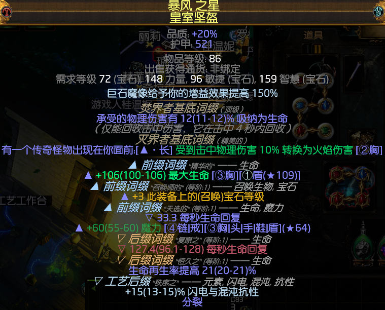 展示的是否为顶配:是 是否绑定:否 是否有可替换暗金:无 低配重点属性顺序:生命 秒回 抗性 等级 装备思路:生存 秒回 魔像等级也加秒回 再生率加秒回 补抗
