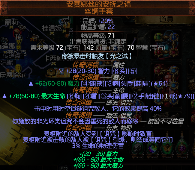 展示的是否为顶配:是 是否绑定:是 是否有可替换暗金:无 低配重点属性顺序:至少腐化出全技能+1 装备思路:刷图炸得不舒服的电捷是莫得灵魂的 手套 秘术升华 都试过 最终还是选择使用这件衣服