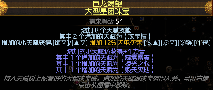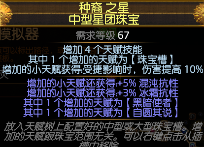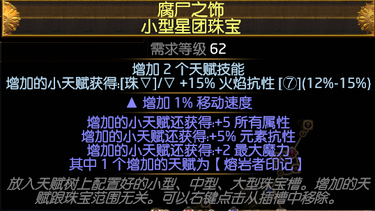 找星团要注意什么: 最好都带有属性和抗性 缺啥补啥 全身都没有普通黄珠宝 所以星团必须要带点 实在没有可以考虑用化石去点出来 如果不特意堆混沌抗性 或者回血能力 那抗性会容易达成很多