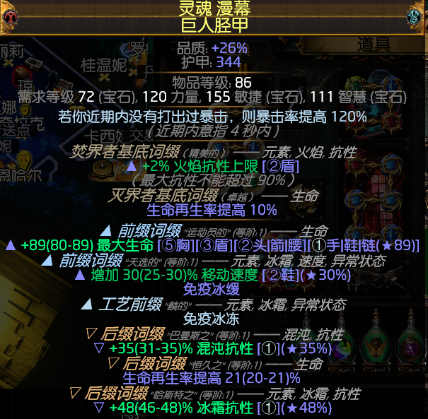 脚 展示的是否为顶配:是 是否绑定:否 是否有可替换暗金:无 低配重点属性顺序:火焰抗性上限 生命 移动 抗性 生命再生 装备思路:把火炕堆到90%然后3抗同时达到90%必备的抗性上限属性 生存 秒回 抗性