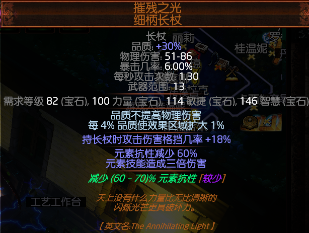 武器 展示的是否为顶配:是 是否绑定:否 是否有可替换暗金:其他电捷能用的武器都行 但是伤害比不上这个 低配重点属性顺序:抗性减少必须60% 装备思路:把伤害放大三倍 比某些镜子武器的伤害都要强