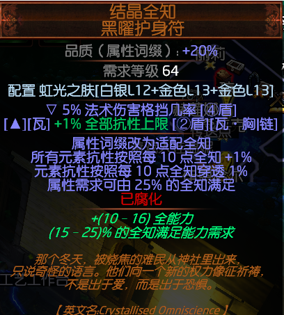 项链: 展示的是否为顶配:是 是否绑定:是 是否有可替换暗金:无 低配重点属性顺序:最好25% 要瓦出所有抗性上限+1 不然达不到90%全抗 装备思路:把火焰抗性提升到90%的一部分 所有属性变成抗性 和穿透 极大增加输出