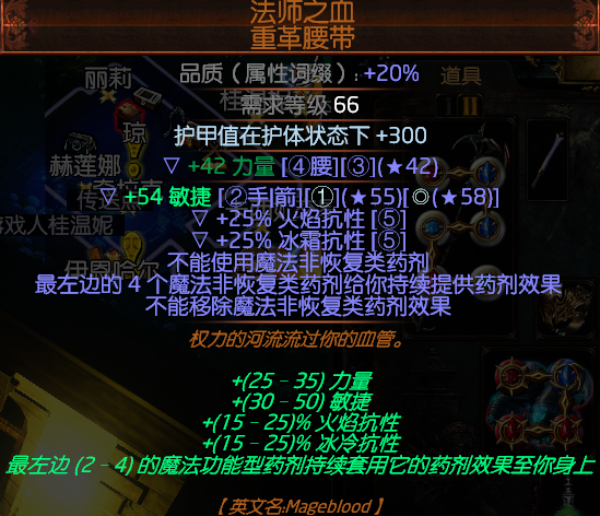 腰带 展示的是否为顶配:是 是否绑定:是 是否有可替换暗金:无 低配重点属性顺序:所有的属性 越高越好 装备思路:常驻4瓶蓝药的药剂效果 给整个BD提供海量的抗性 移动 护甲等