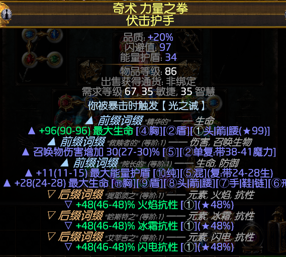 手1 展示的是否为顶配:是 是否绑定:否 是否有可替换暗金:尸僵暗金手套 低配重点属性顺序:生命 回复 增伤 装备思路:生存 增伤