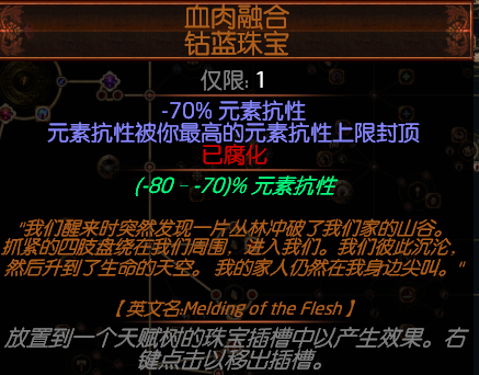 元素减伤: 血肉融合珠宝+90%多3元素抗性+90%火抗上限+免疫诅咒 全域减伤:疲惫(怪击中伤害减少20% 惩戒获得)